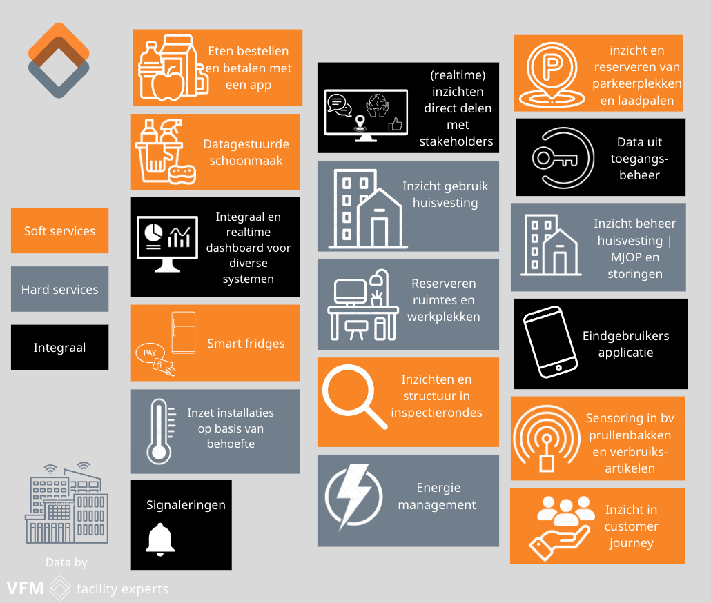 VFM gelooft in een integrale aanpak van datamanagement, die soft- en hardservices combineert. Veel systemen, dashboards etc. worden vanuit één type dienstverlening of één invalshoek benaderd. Bijvoorbeeld wanneer een facilitaire organisatie meer behoefte heeft aan data-gestuurde schoonmaak wordt de schoonmaakpartij voor een systeem benaderd.